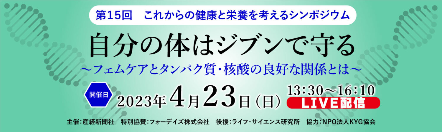 第15回 これからの健康と栄養を考えるシンポジウム 自分の体はジブンで守る~フェムケアとタンパク質・核酸の良好な関係とは~のライブ配信は終了いたしました。